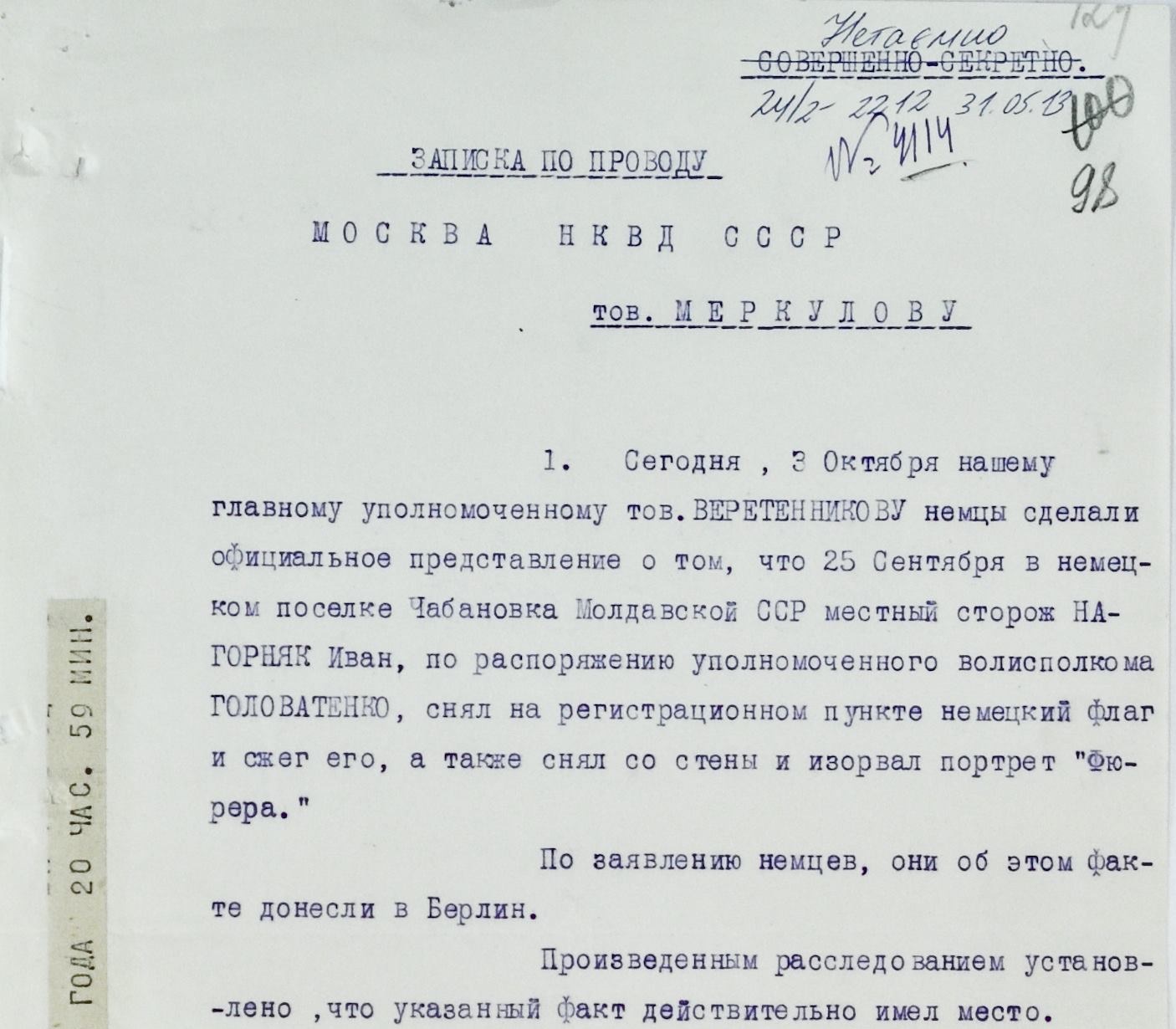 В начале октября 1940 года из Кишинева в Киев пришло сообщение о чрезвычайном происшествии в молдавском селе Чабановка*. Утверждалось, что местный сторож Иван Нагорняк «на регистрационном пункте забрал немецкий флаг, сжег, снял со стены портрет фюрера и изорвал».